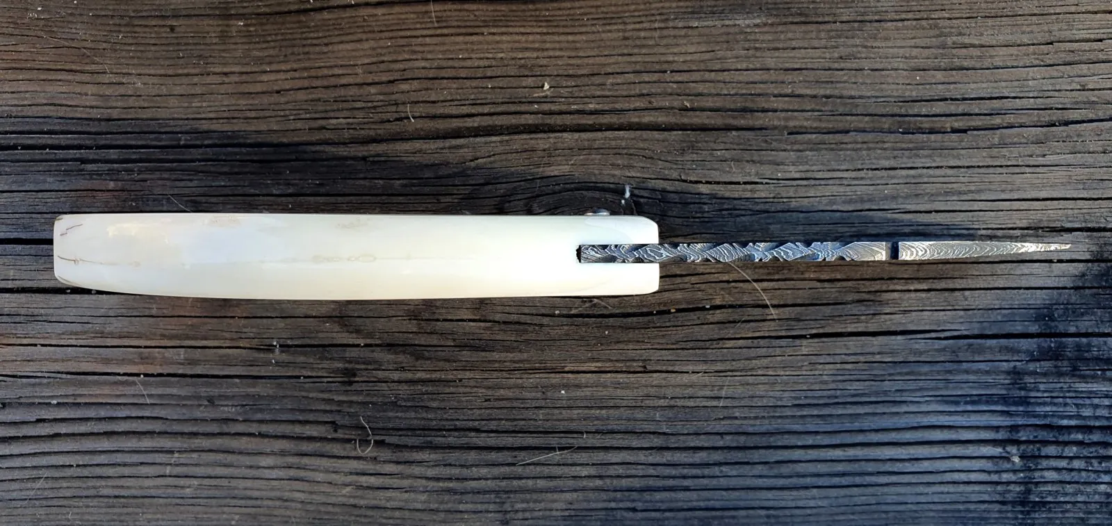 Un couteau corse pliant de fabrication traditionnelle Labellisé avec une Lame damas plume épaisseur de 4 mm avec un manche réalisé en défense de phacochère