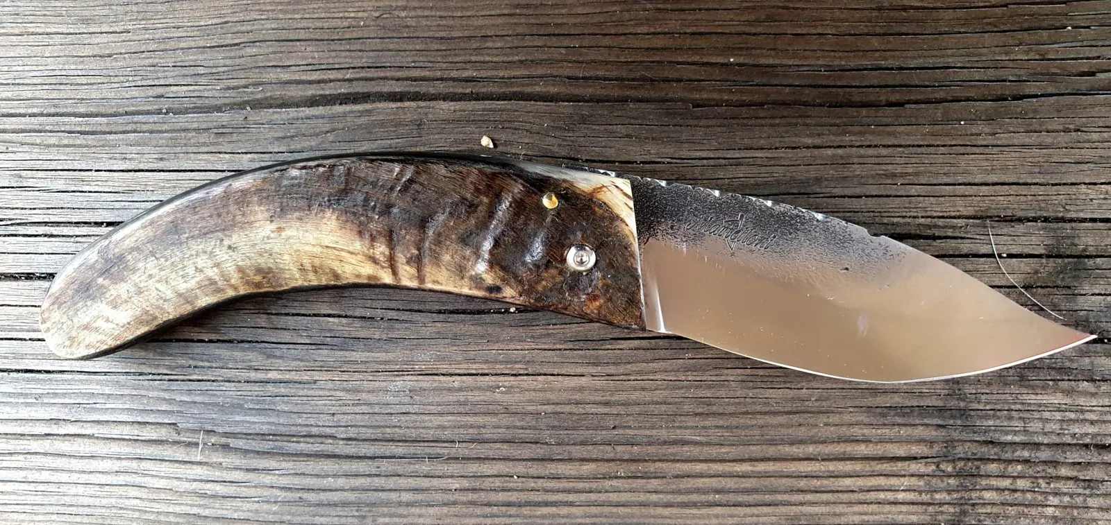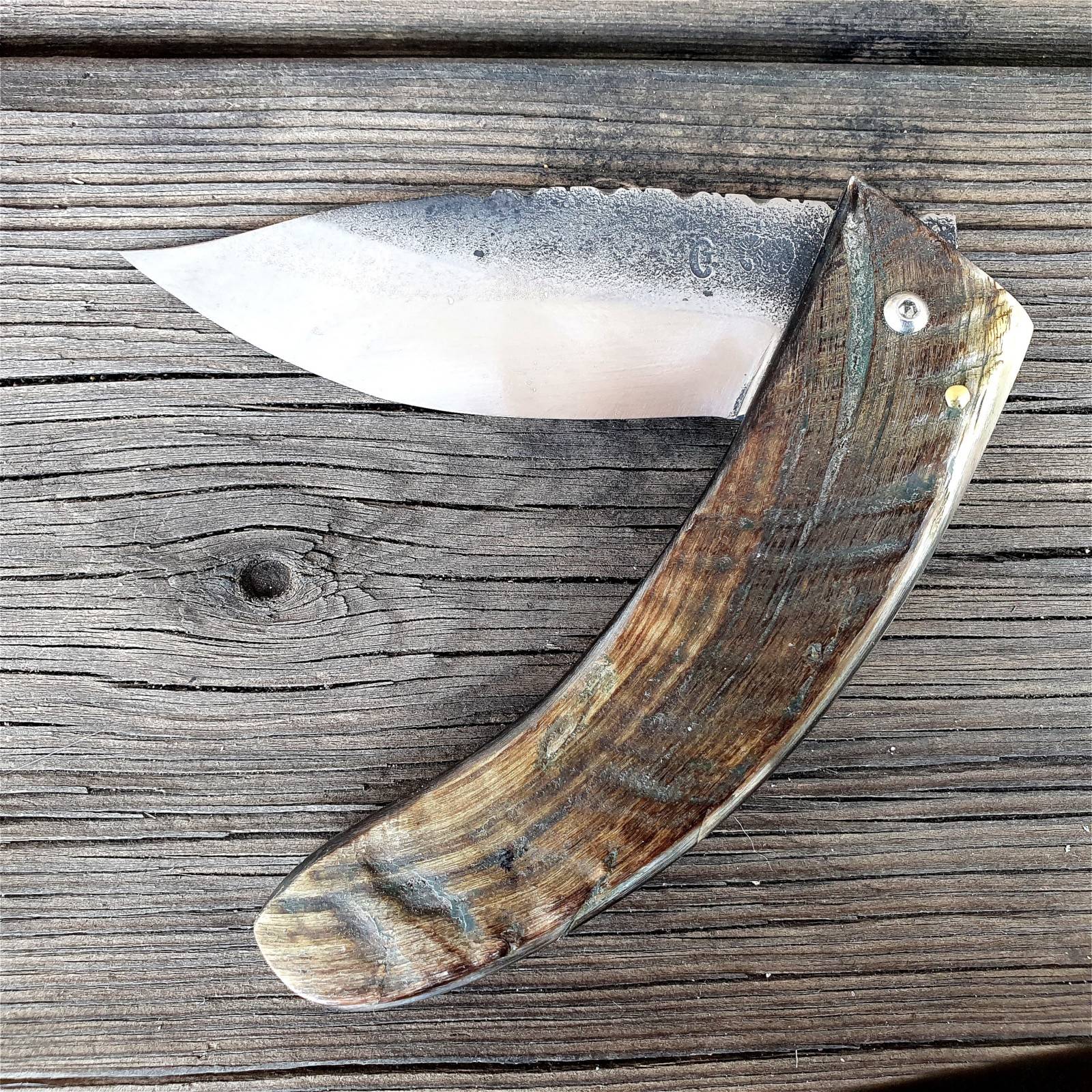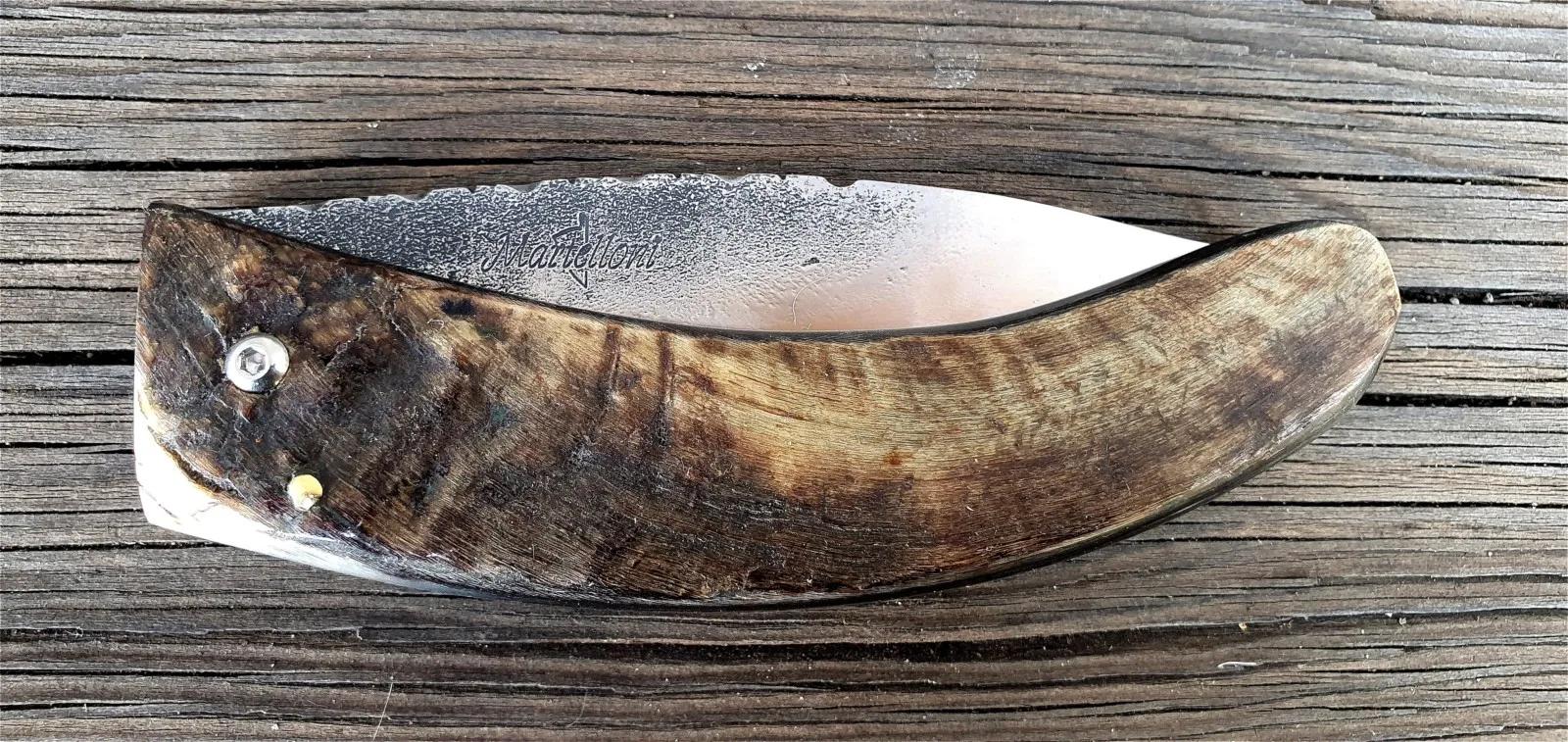 Un couteau corse pliant de fabrication traditionnelle Labellisé avec une Lame acier épaisseur de 3 mm avec un manche réalisé en corne de bélier