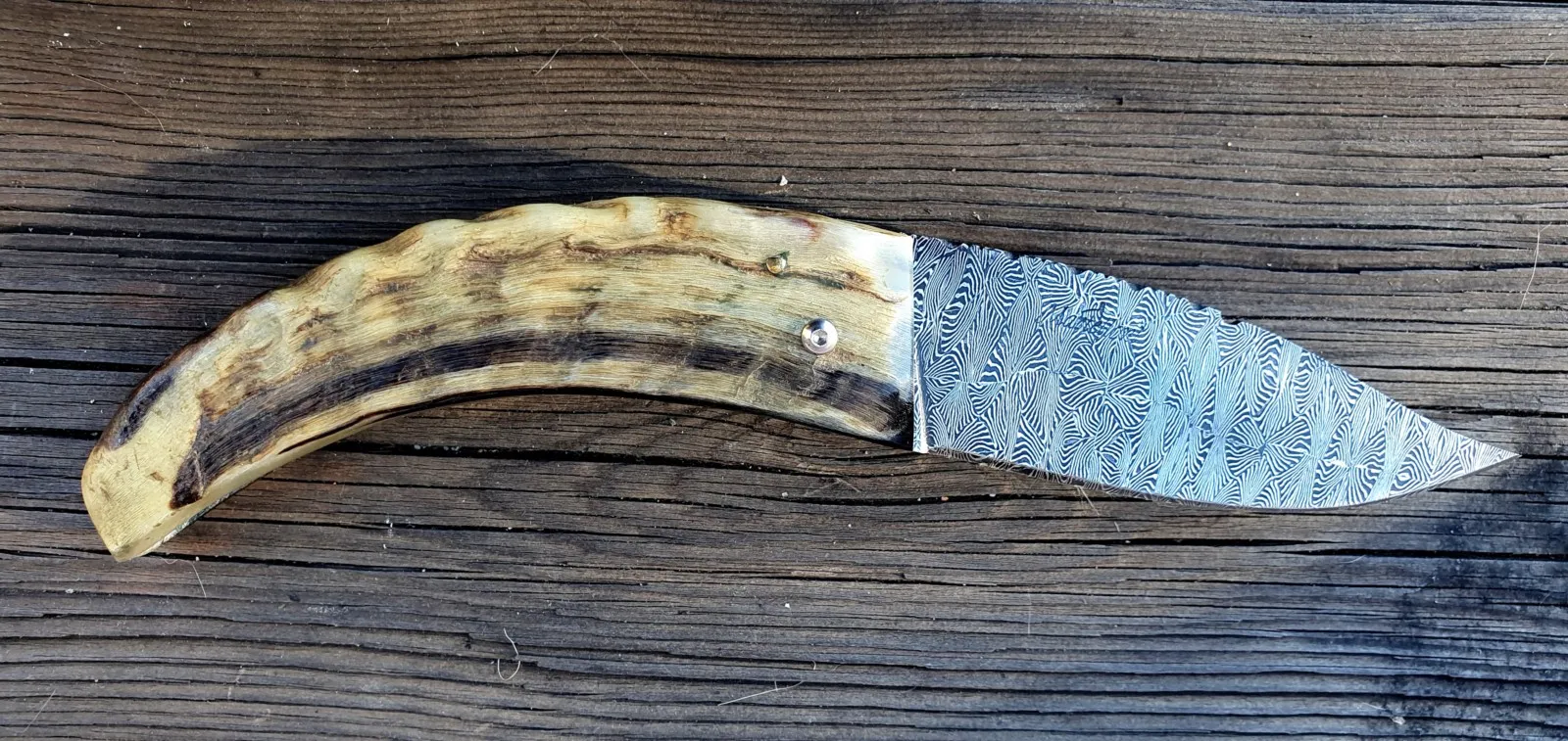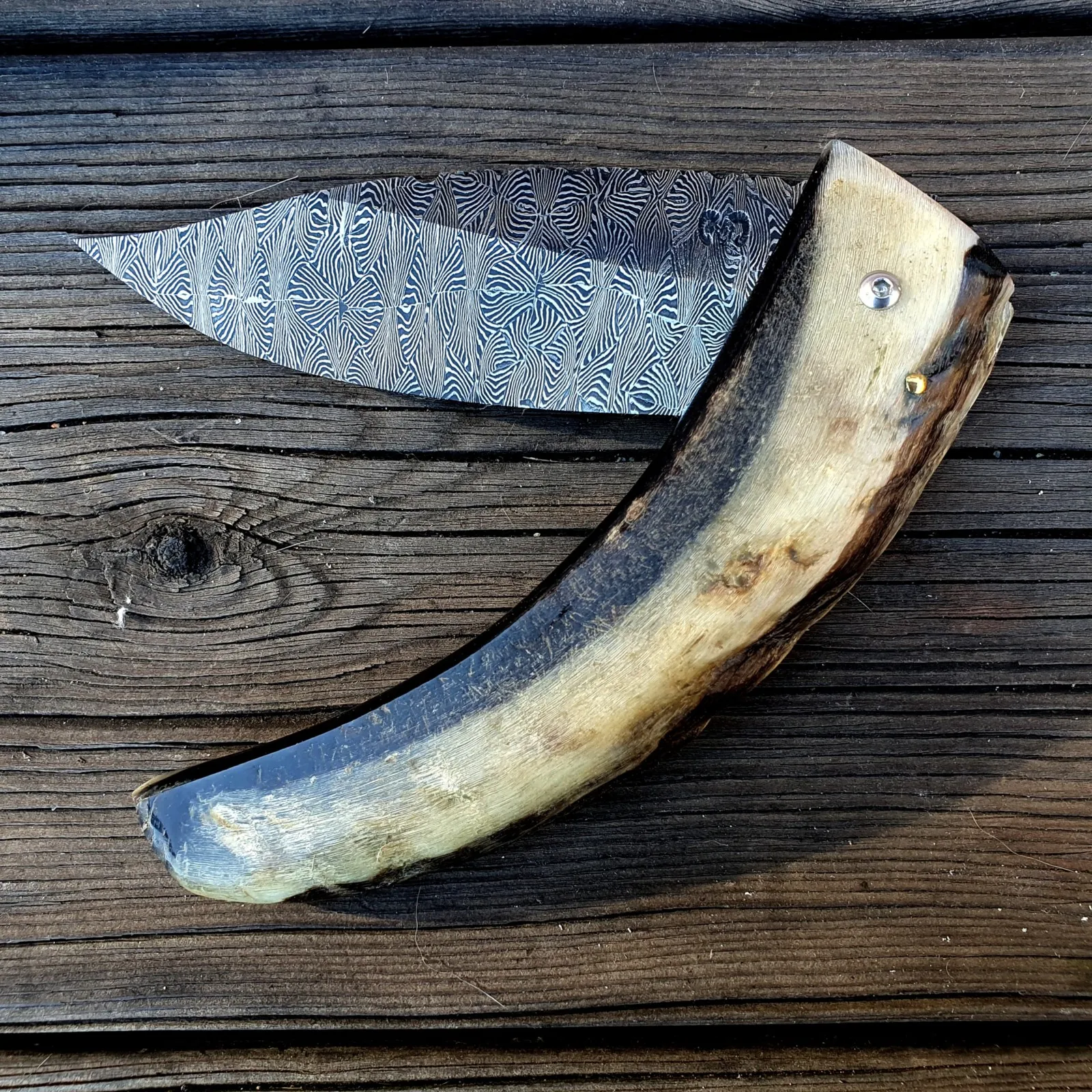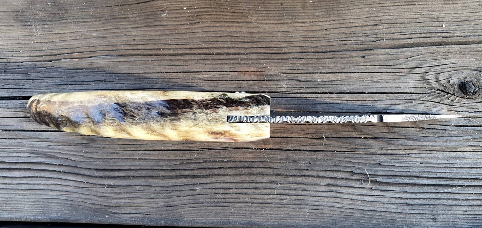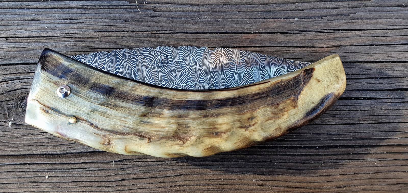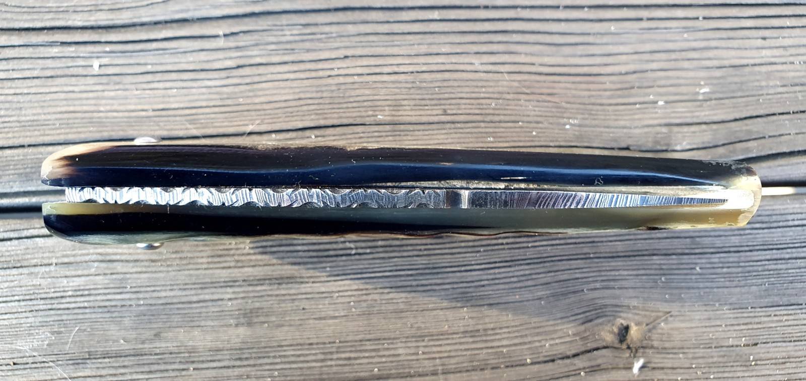 Un couteau corse pliant de fabrication traditionnelle Labellisé avec une Lame damas mosaïque épaisseur de 3,5 mm avec un manche réalisé en corne de bélier .Label Qualité " Fattu in Corsica"