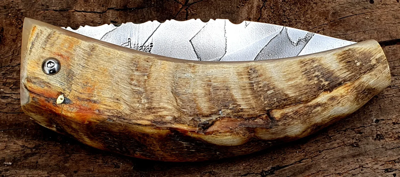 Un couteau corse pliant de fabrication traditionnelle Labellisé avec une Lame damas mosaïque épaisseur de 4 mm avec un manche réalisé en corne de bélier .Label Qualité " Fattu in Corsica"