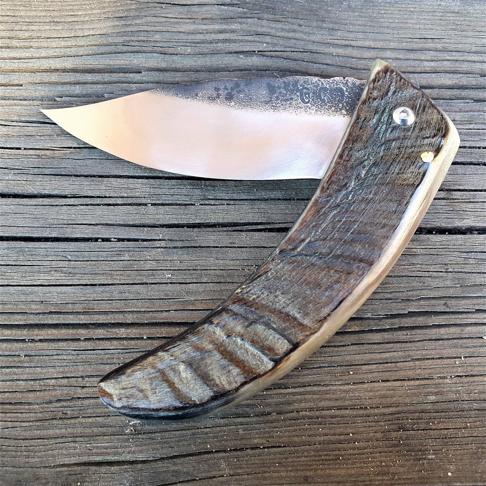 Un couteau corse pliant de fabrication traditionnelle Labellisé avec une Lame acier 8 cm épaisseur de 3 mm avec un manche réalisé en corne de bélier .