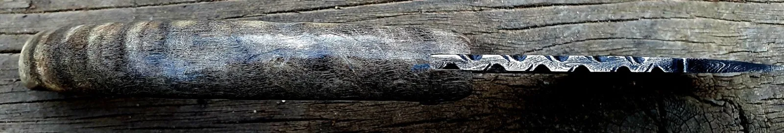 Un couteau corse pliant de fabrication traditionnelle Labellisé avec une Lame damas épaisseur de 3,5 mm avec un manche réalisé en corne de bélier