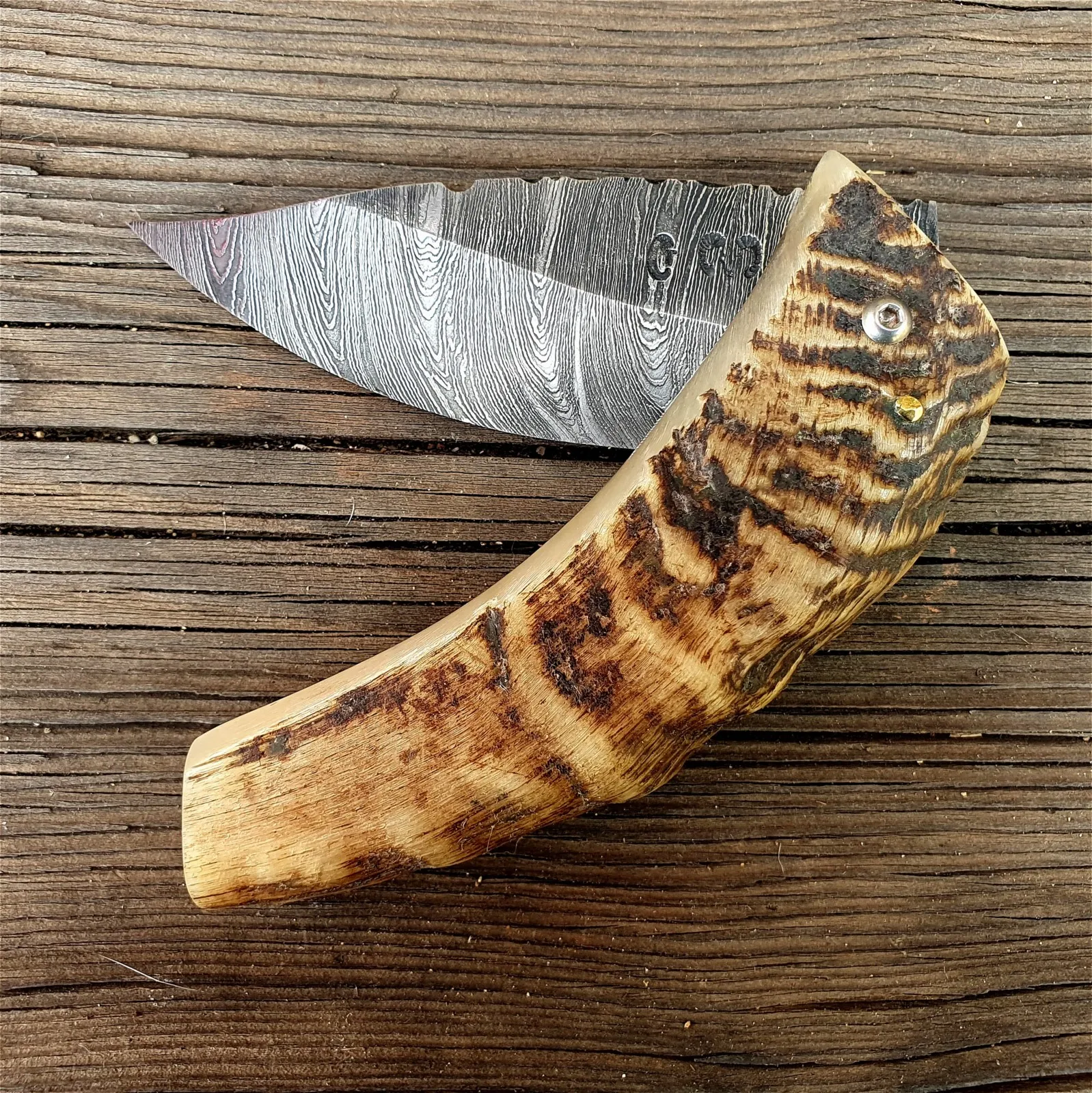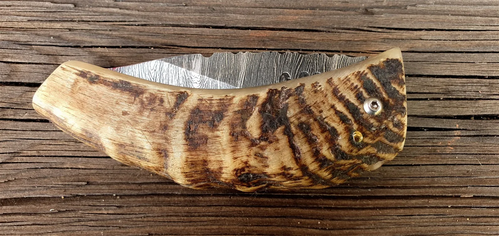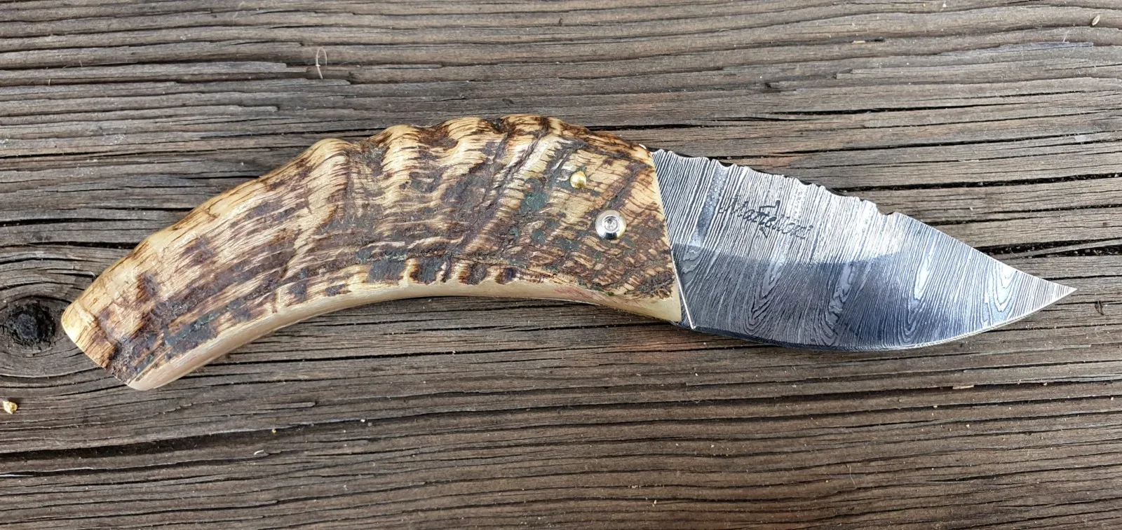 Un couteau corse pliant de fabrication traditionnelle Labellisé avec une Lame damas épaisseur de 4 mm avec un manche réalisé en corne de bélier