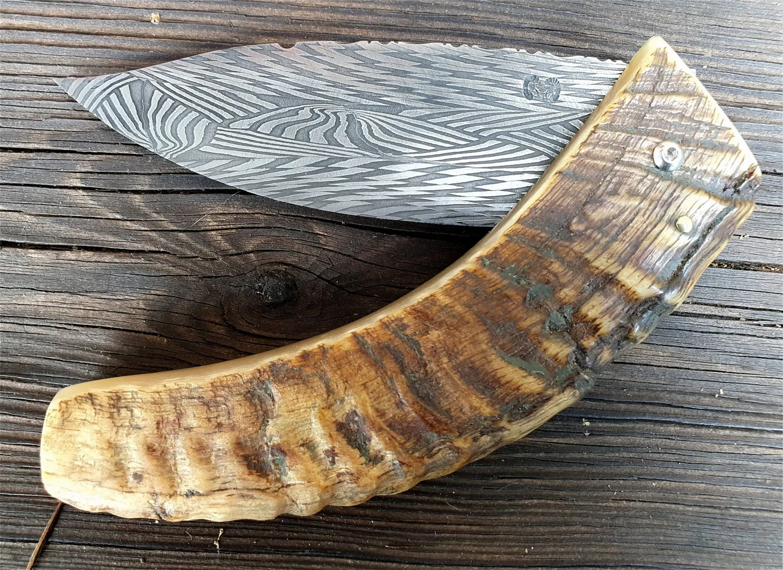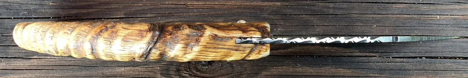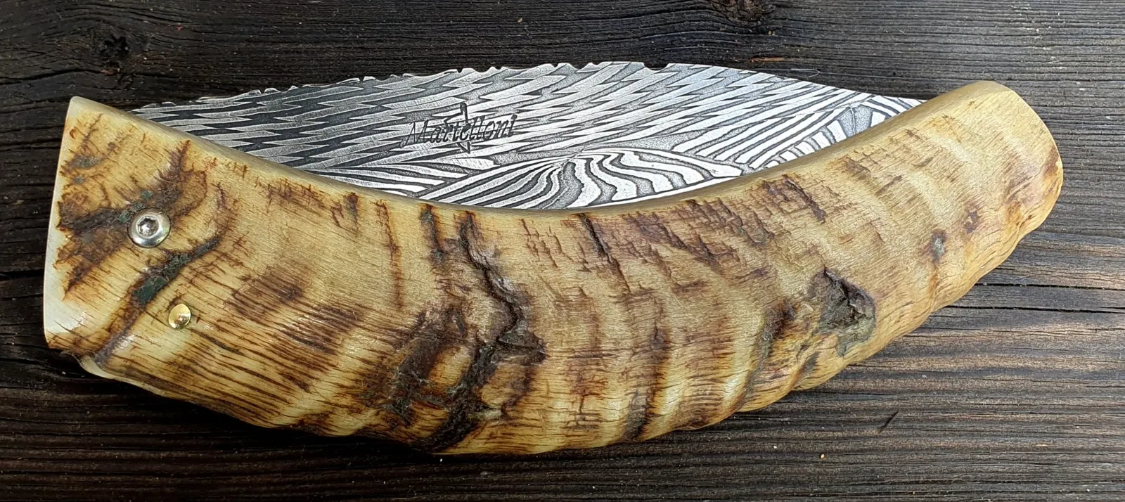 Un couteau corse pliant de fabrication traditionnelle Labellisé avec une Lame damas mosaïque épaisseur de 3 mm avec un manche réalisé en corne de bélier .Label Qualité " Fattu in Corsica"