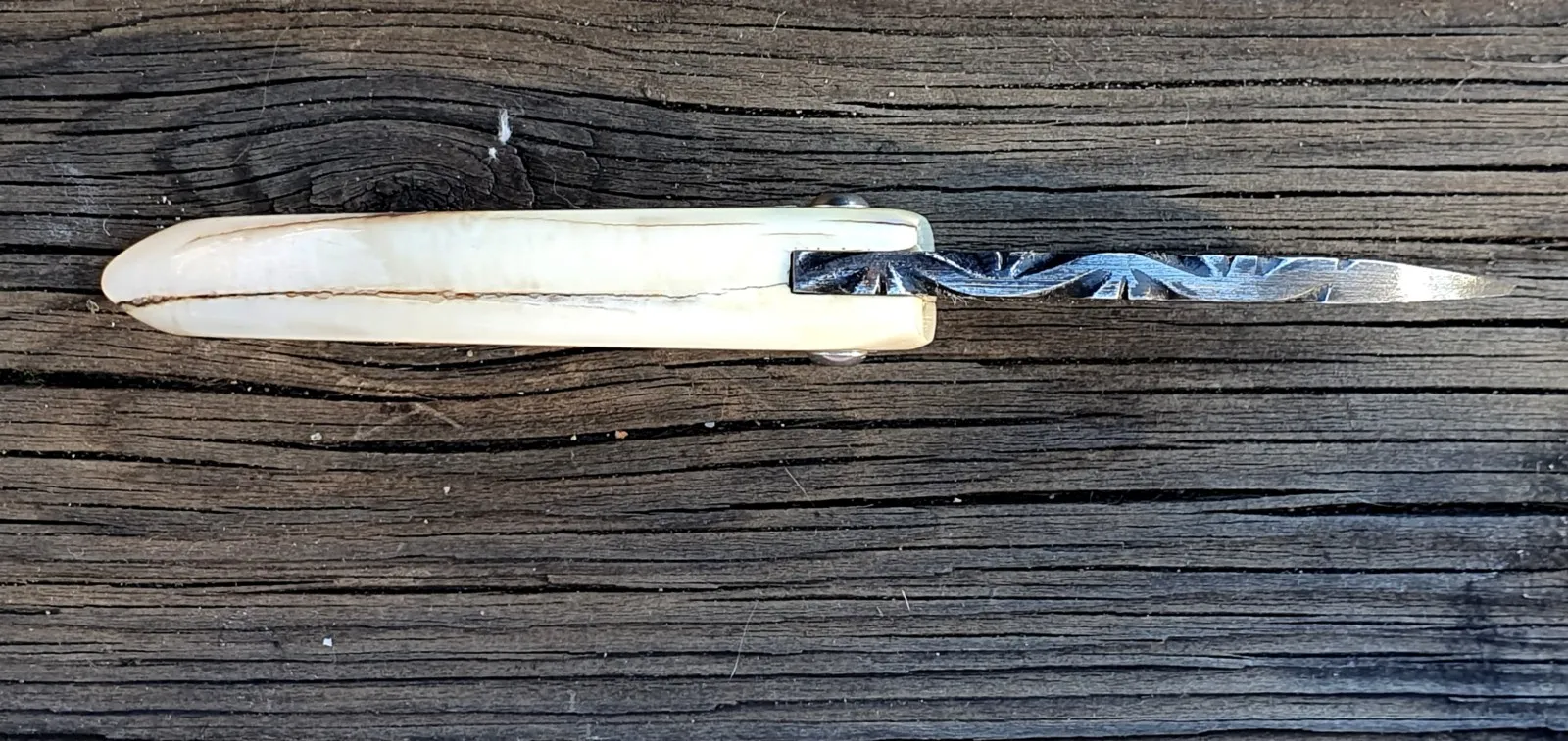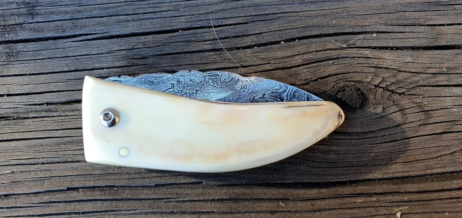 Un couteau corse pliant de fabrication traditionnelle Labellisé avec une Lame damas épaisseur de 4 mm avec un manche réalisé en défense de phacochère