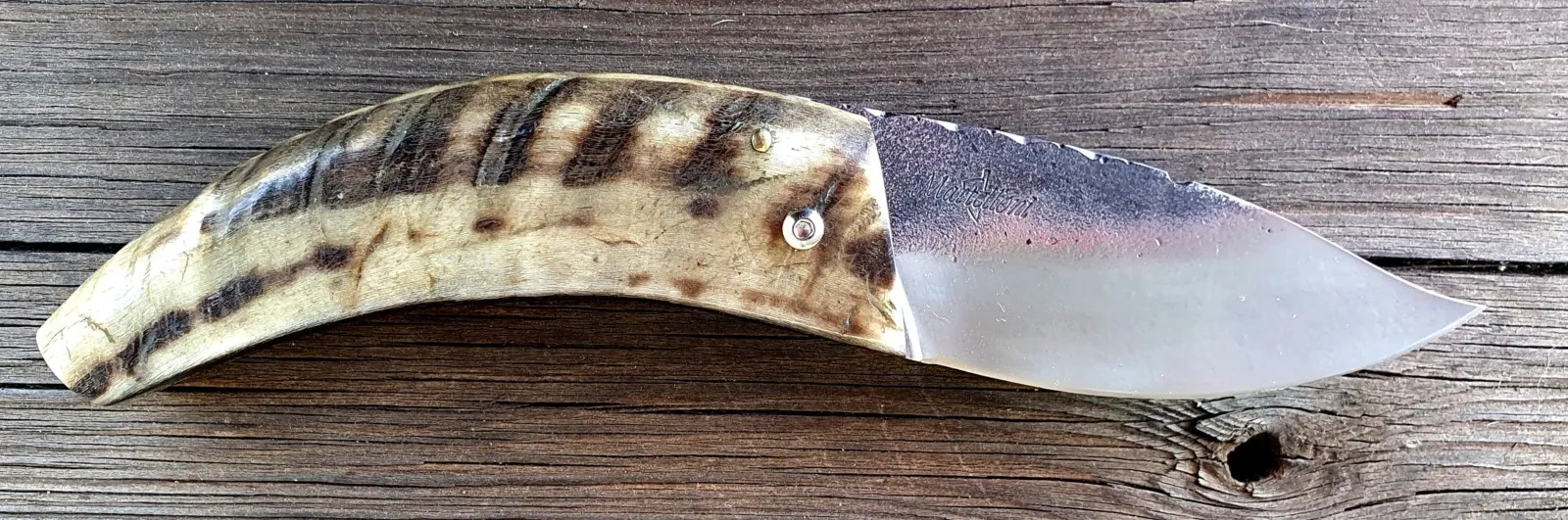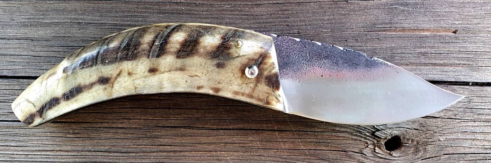 Un couteau corse pliant de fabrication traditionnelle Labellisé avec une Lame acier épaisseur de 3 mm avec un manche réalisé en corne de bélier