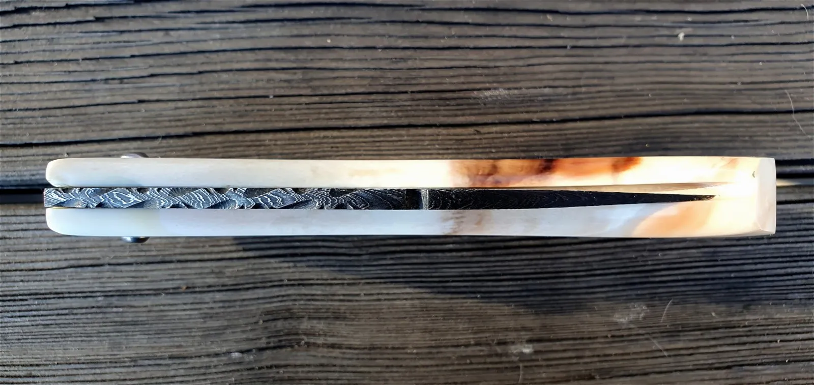 Un couteau corse pliant de fabrication traditionnelle Labellisé avec une Lame damas plume épaisseur de 4 mm avec un manche réalisé en défense de phacochère
