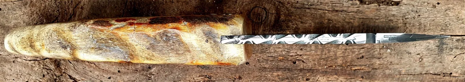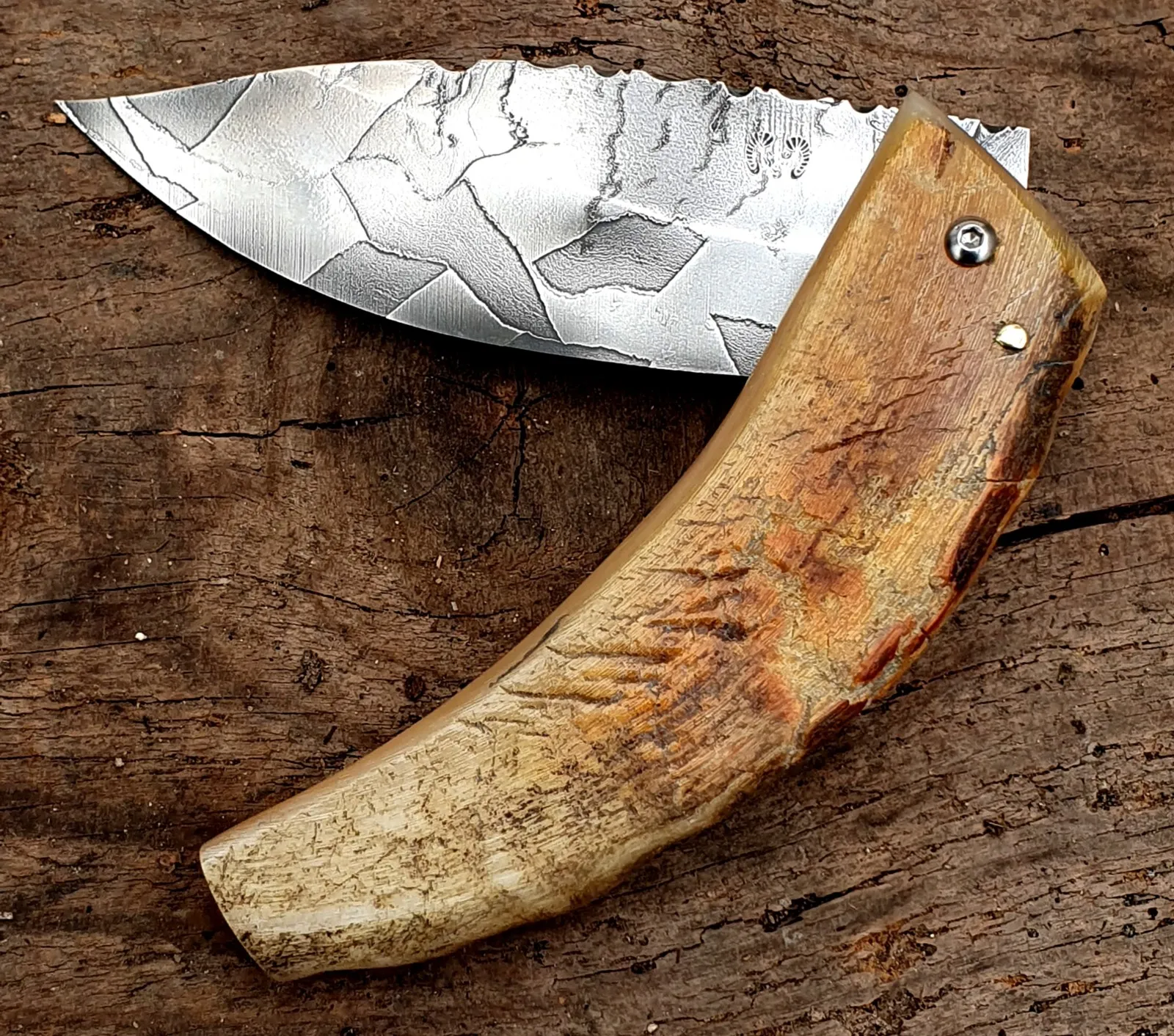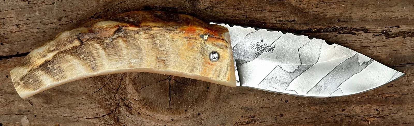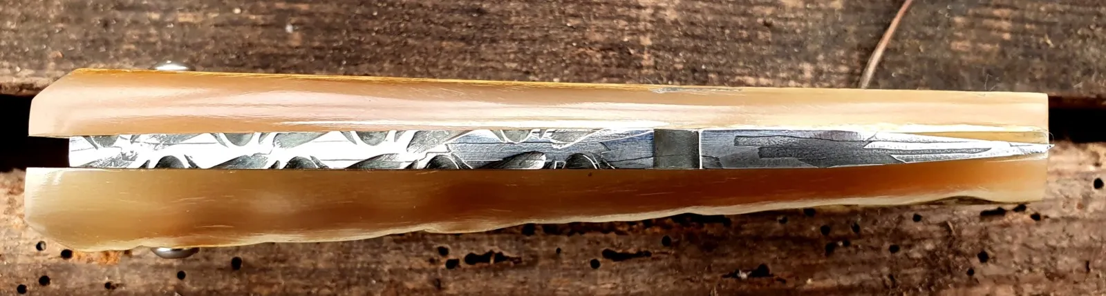 Un couteau corse pliant de fabrication traditionnelle Labellisé avec une Lame damas mosaïque épaisseur de 4 mm avec un manche réalisé en corne de bélier .Label Qualité " Fattu in Corsica"