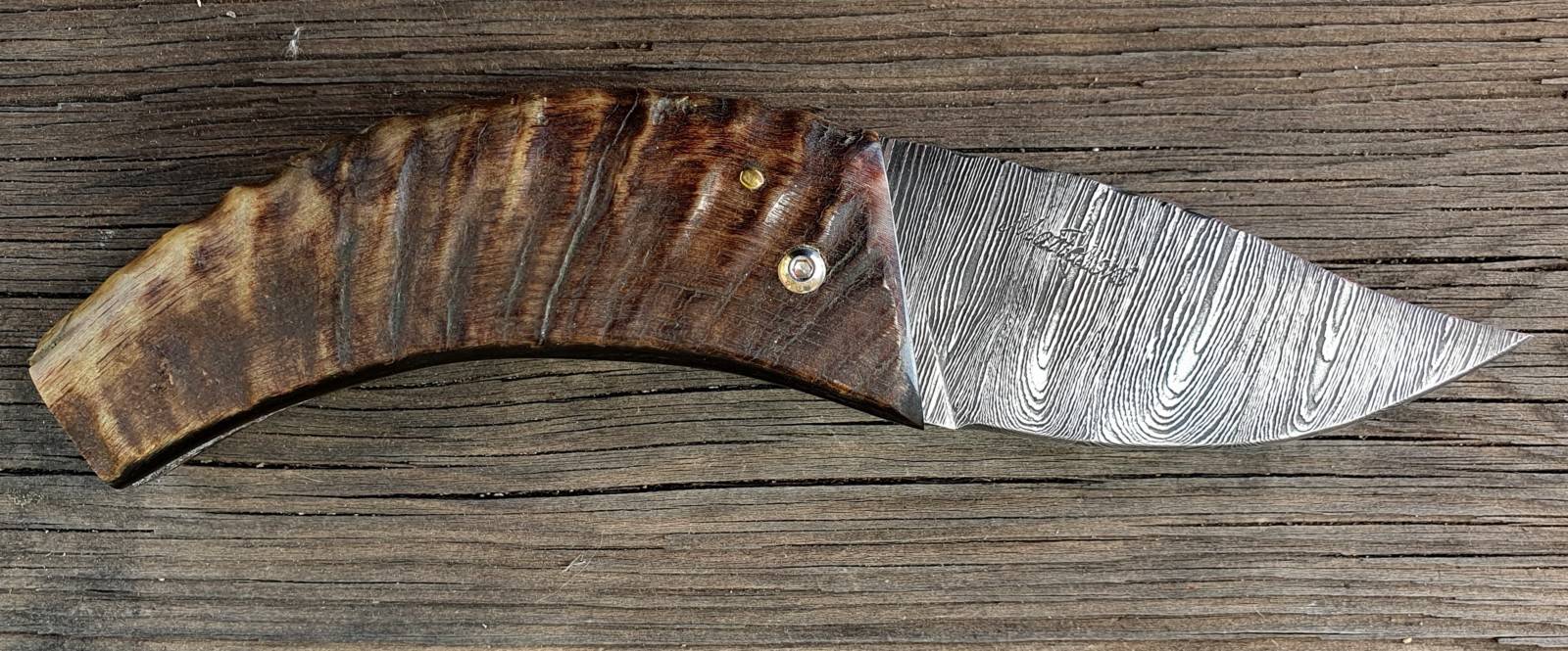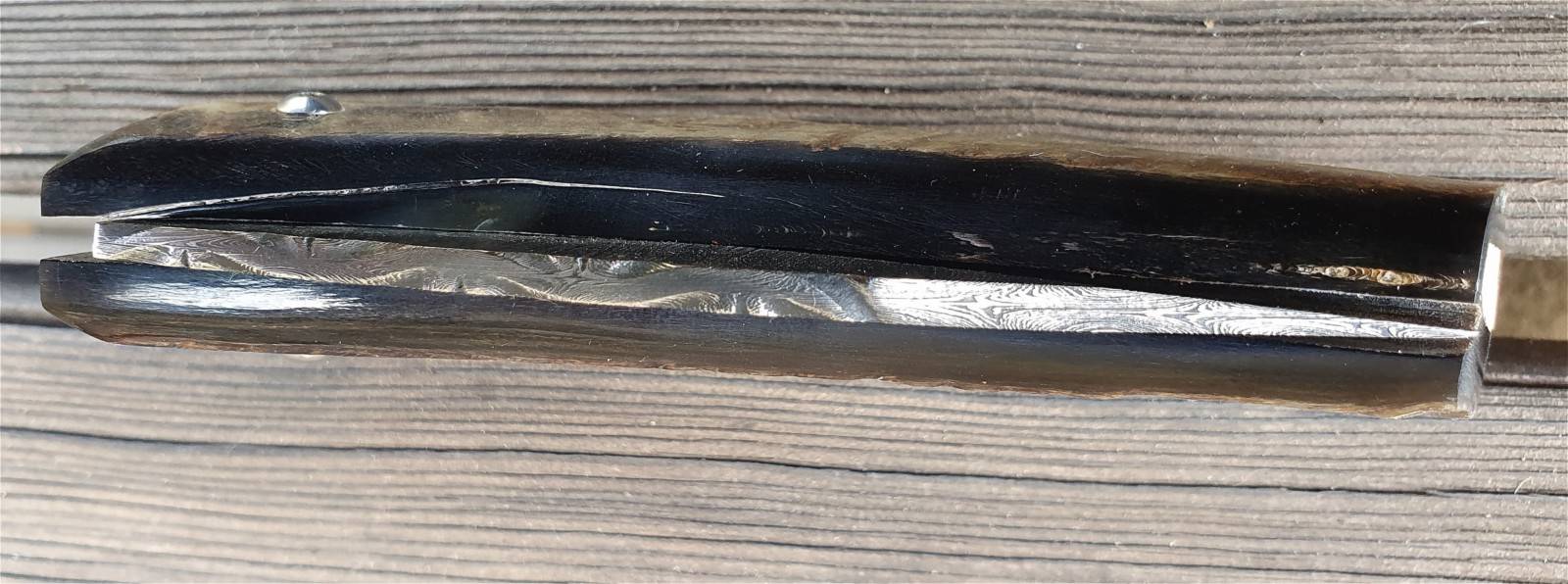 Un couteau corse pliant de fabrication traditionnelle Labellisé avec une Lame damas épaisseur de 4 mm avec un manche réalisé en corne de bélier .