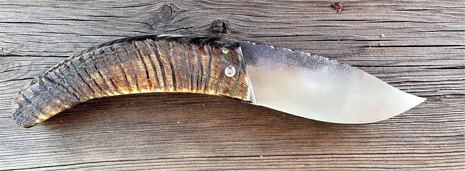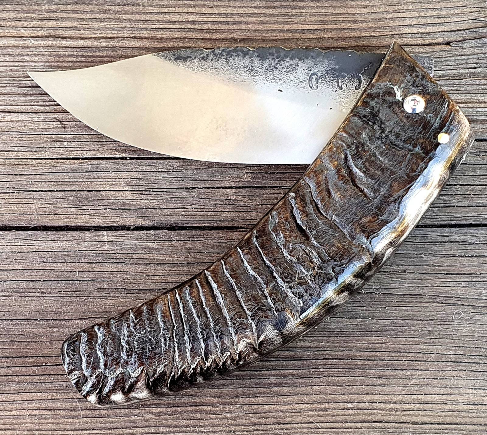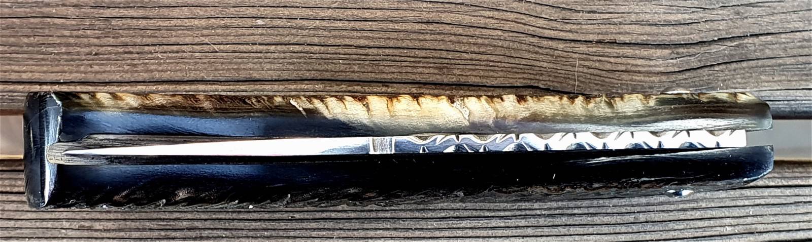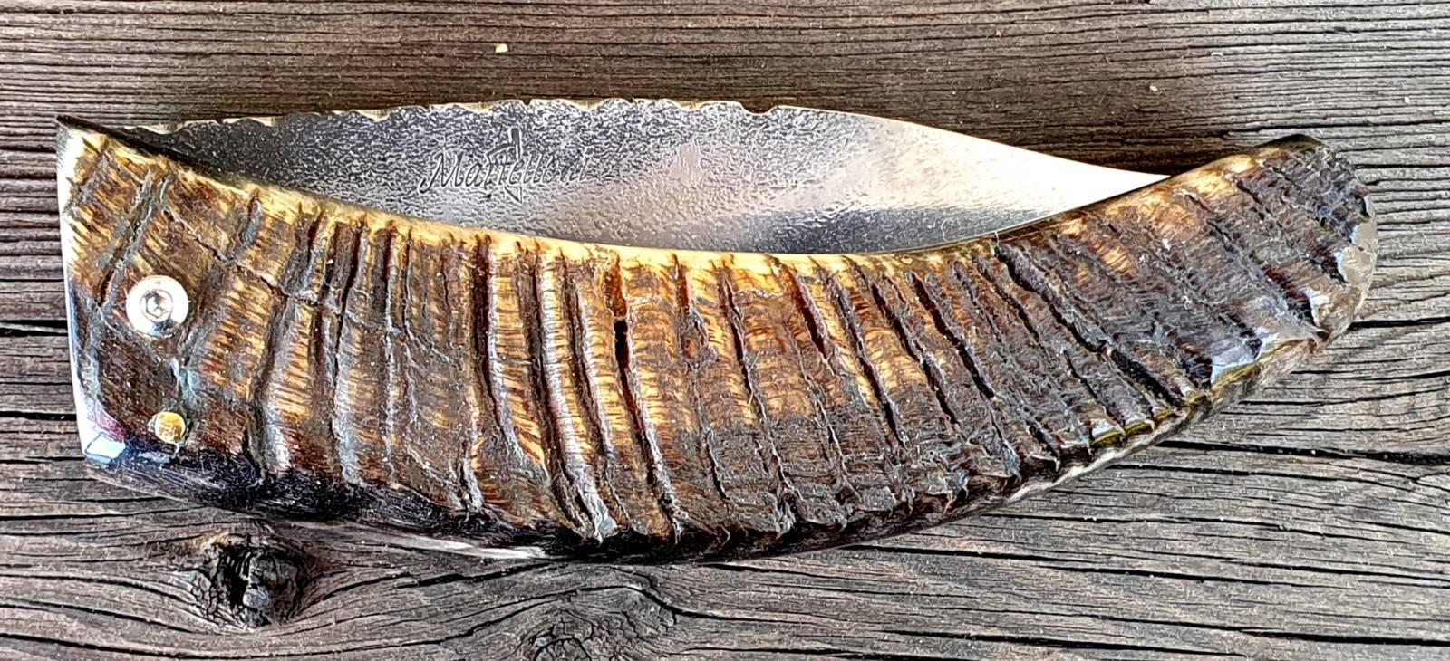 Un couteau corse pliant de fabrication traditionnelle Labellisé avec une Lame de acier épaisseur de 3 mm avec un manche réalisé en corne de bélier .