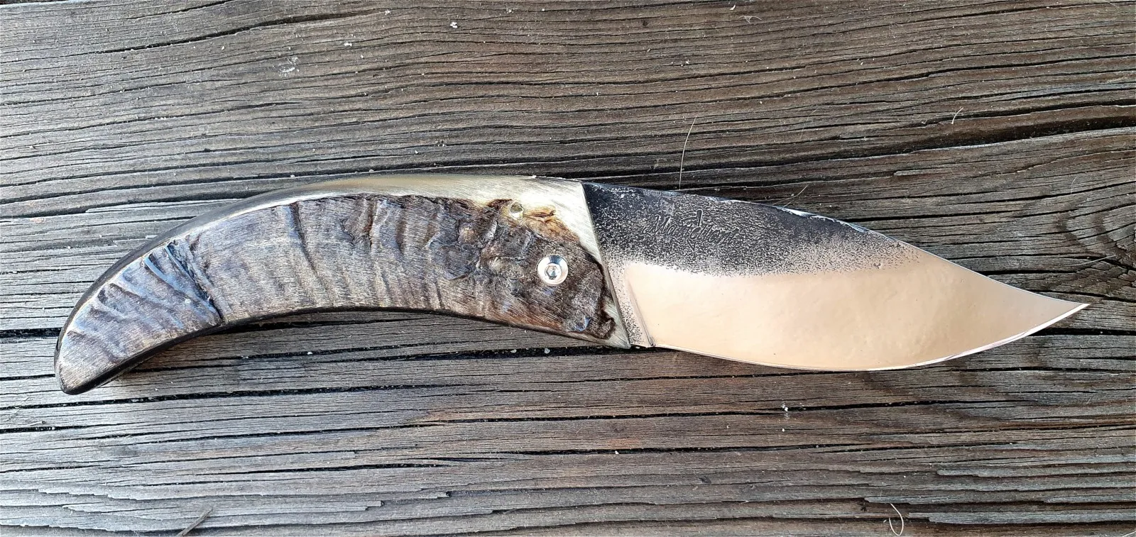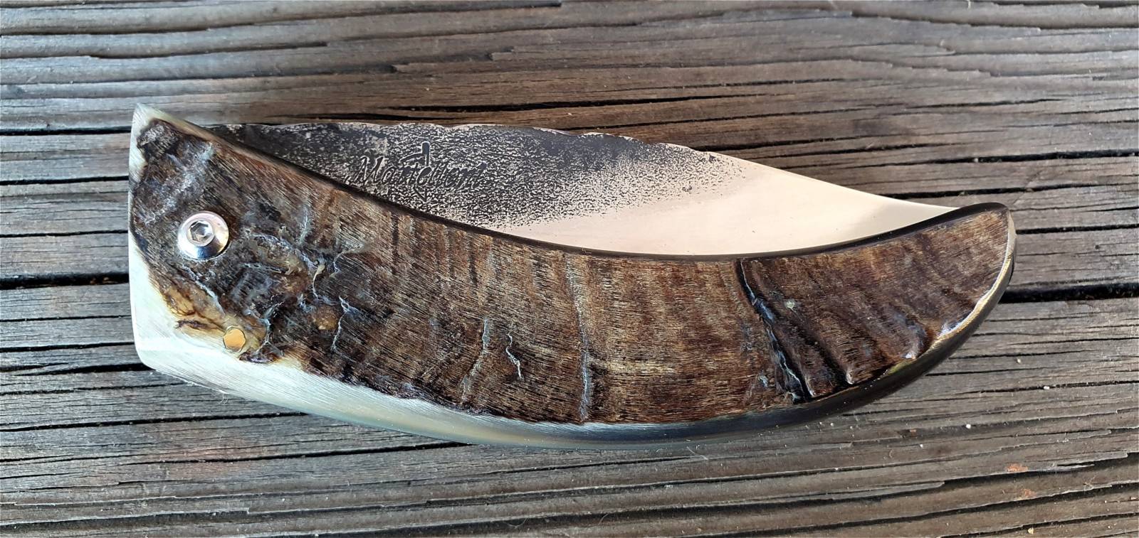 Un couteau corse pliant de fabrication traditionnelle Labellisé avec une Lame acier 8 cm épaisseur de 3 mm avec un manche réalisé en corne de bélier .