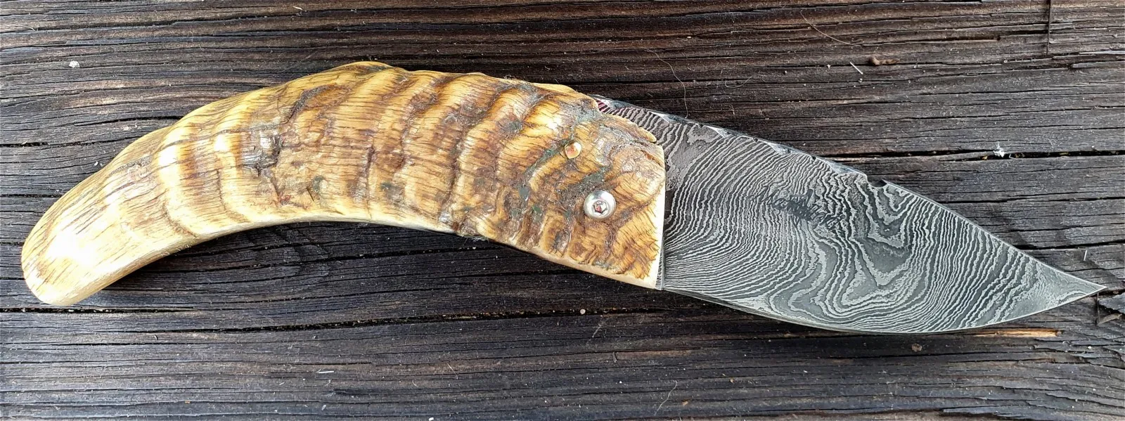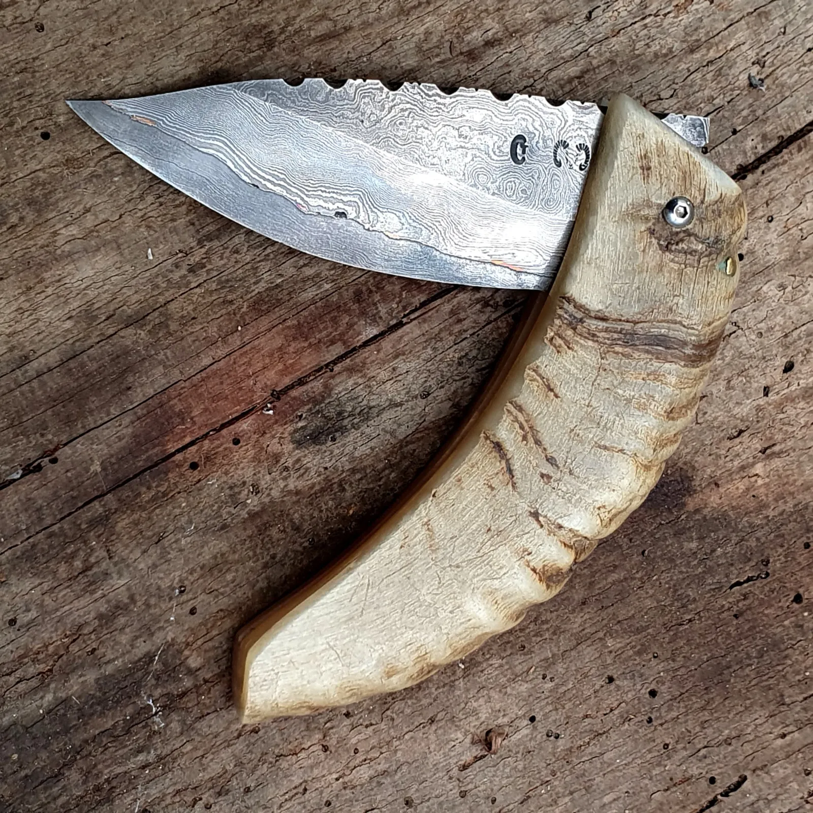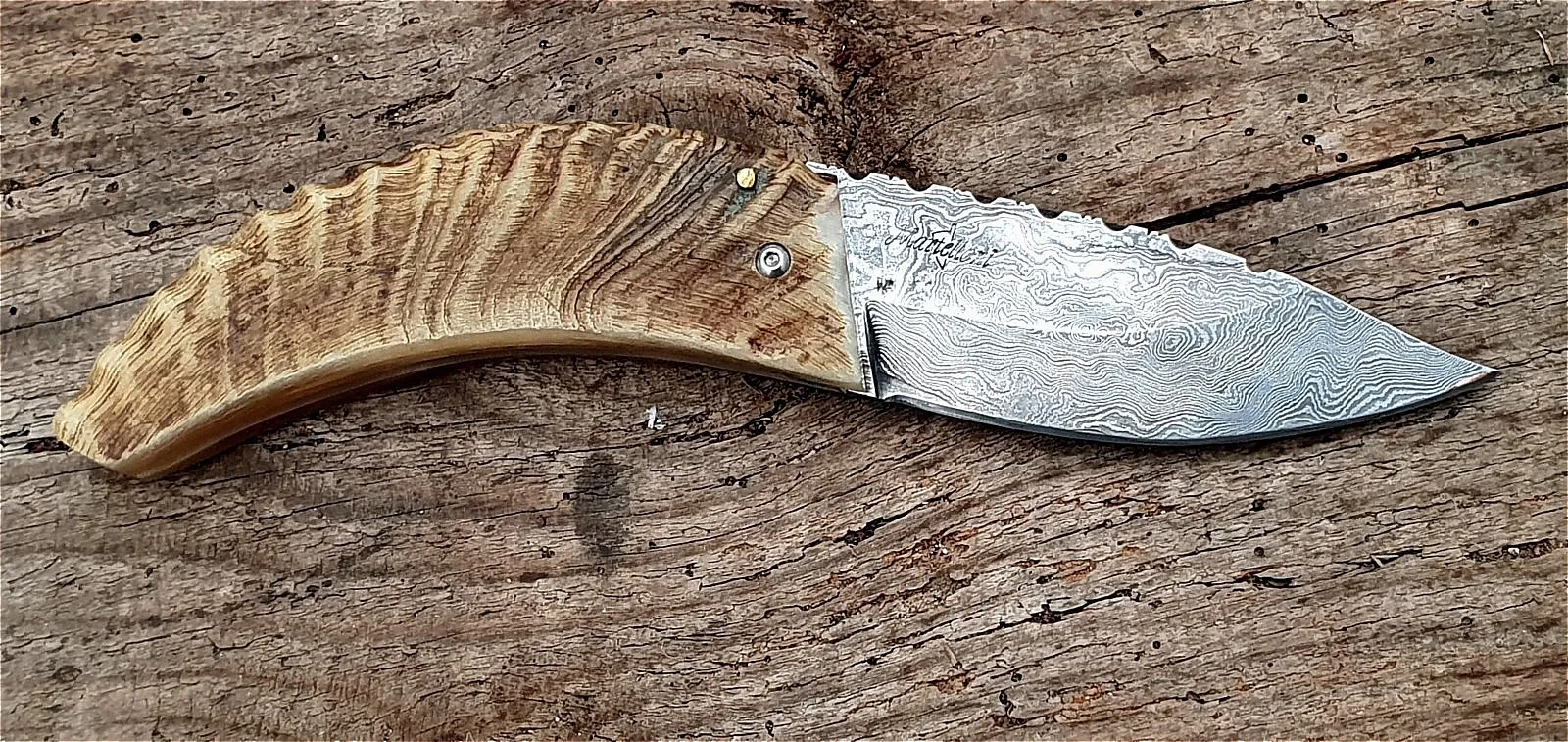 Un couteau corse pliant de fabrication traditionnelle Labellisé avec une Lame damas épaisseur de 4 mm avec un manche réalisé en corne de bélier