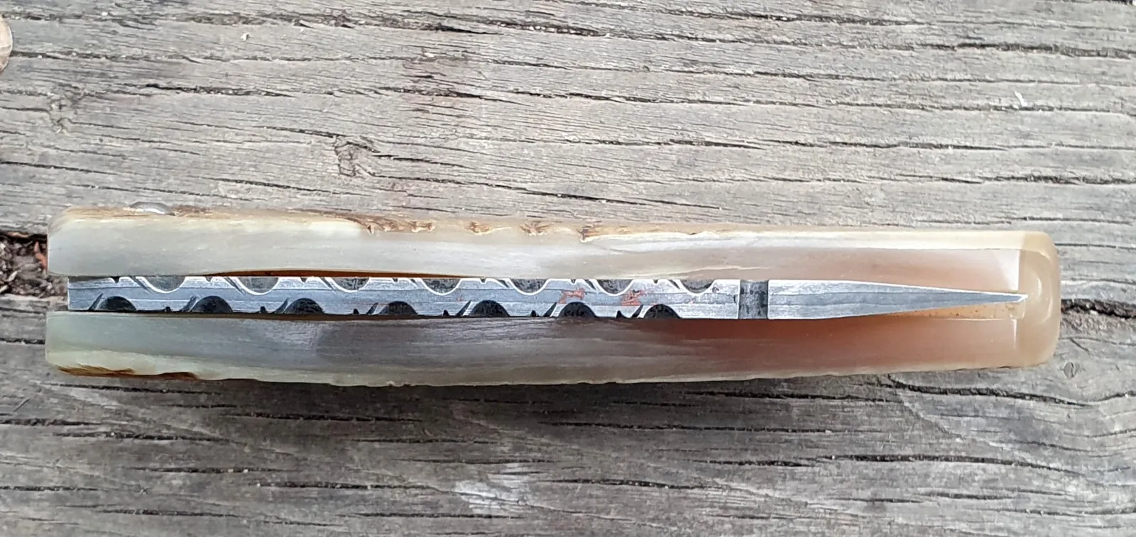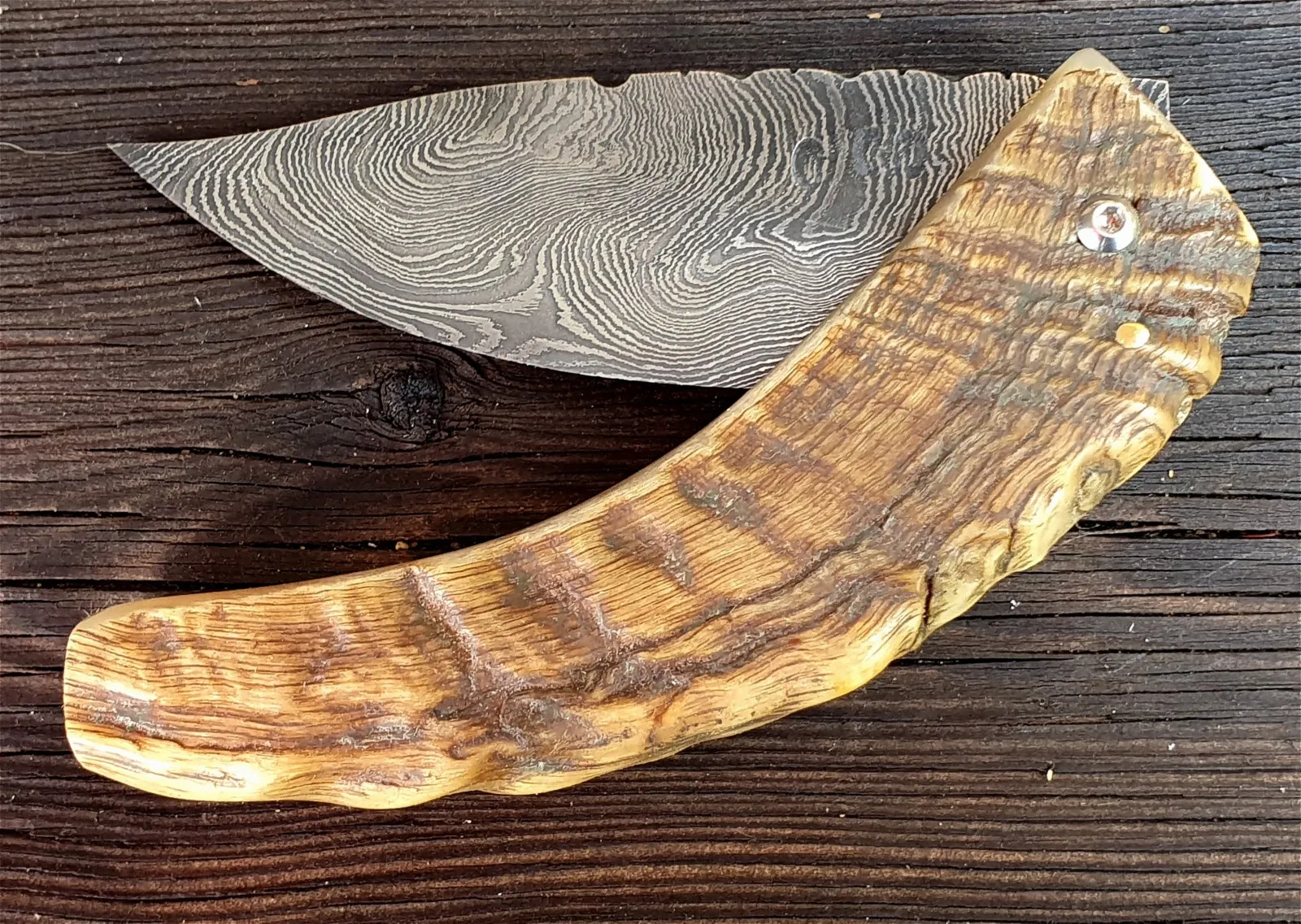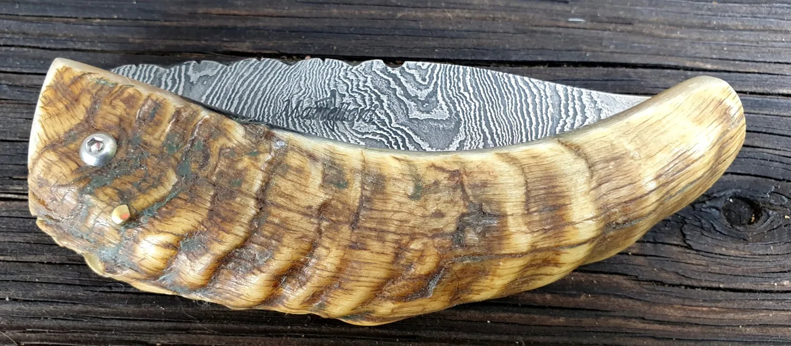 Un couteau corse pliant de fabrication traditionnelle Labellisé avec une Lame damas épaisseur de 4 mm avec un manche réalisé en corne de bélier