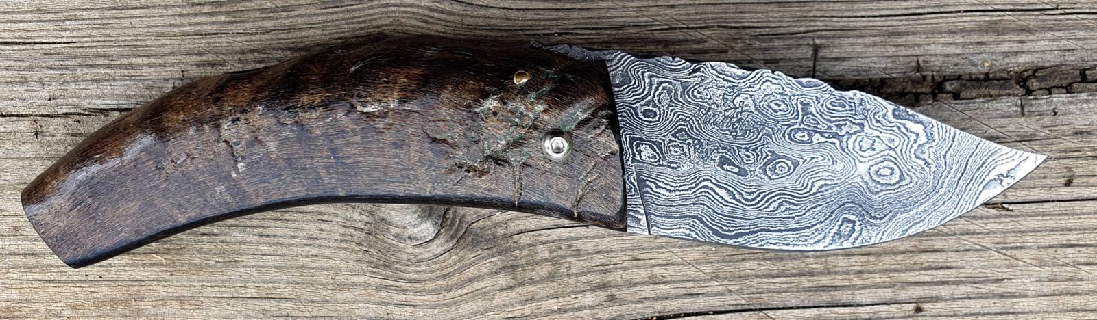 Un couteau corse pliant de fabrication traditionnelle Labellisé avec une Lame damas épaisseur de 4 mm avec un manche réalisé en corne de bélier