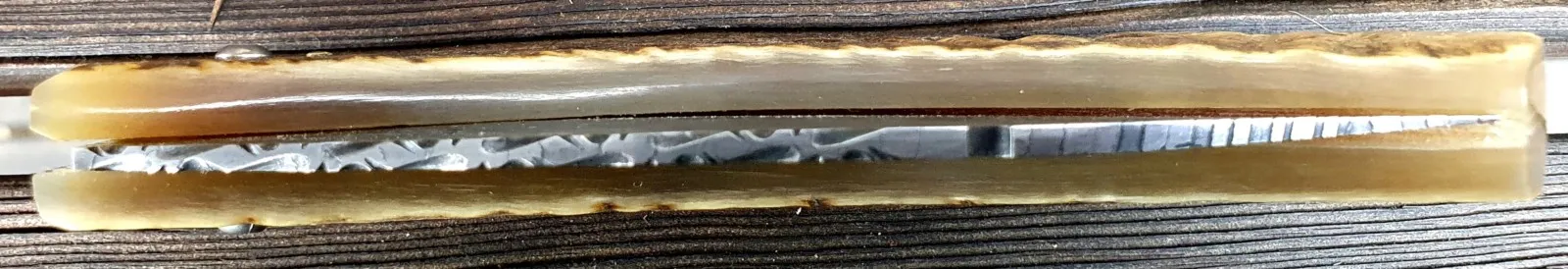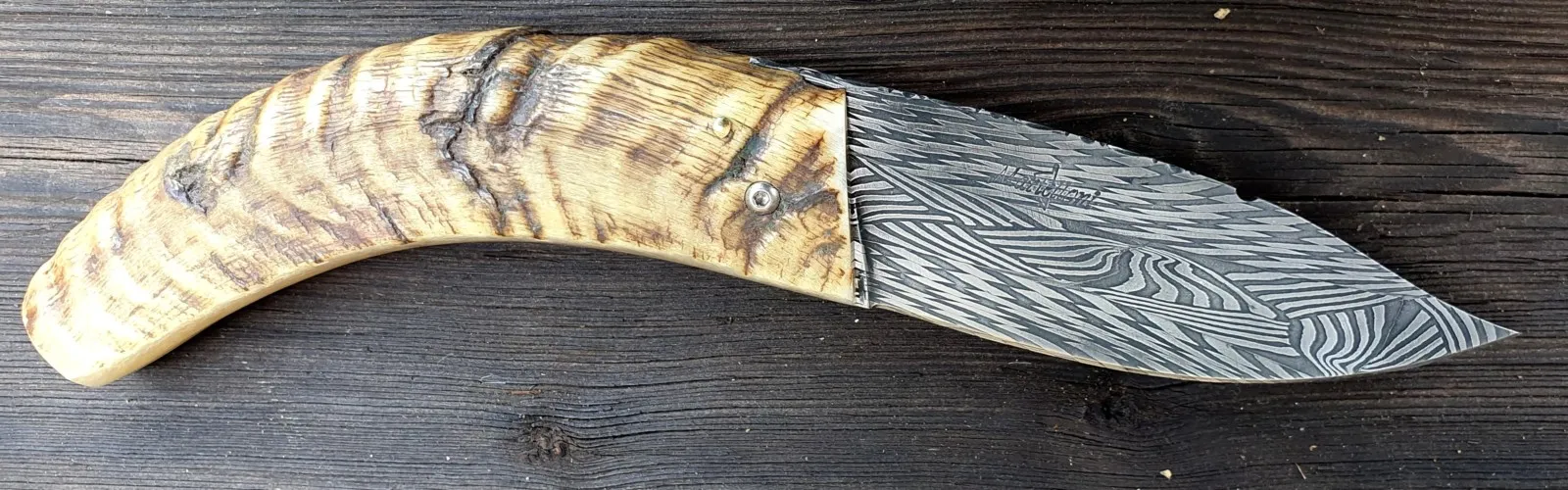 Un couteau corse pliant de fabrication traditionnelle Labellisé avec une Lame damas mosaïque épaisseur de 3 mm avec un manche réalisé en corne de bélier .Label Qualité " Fattu in Corsica"