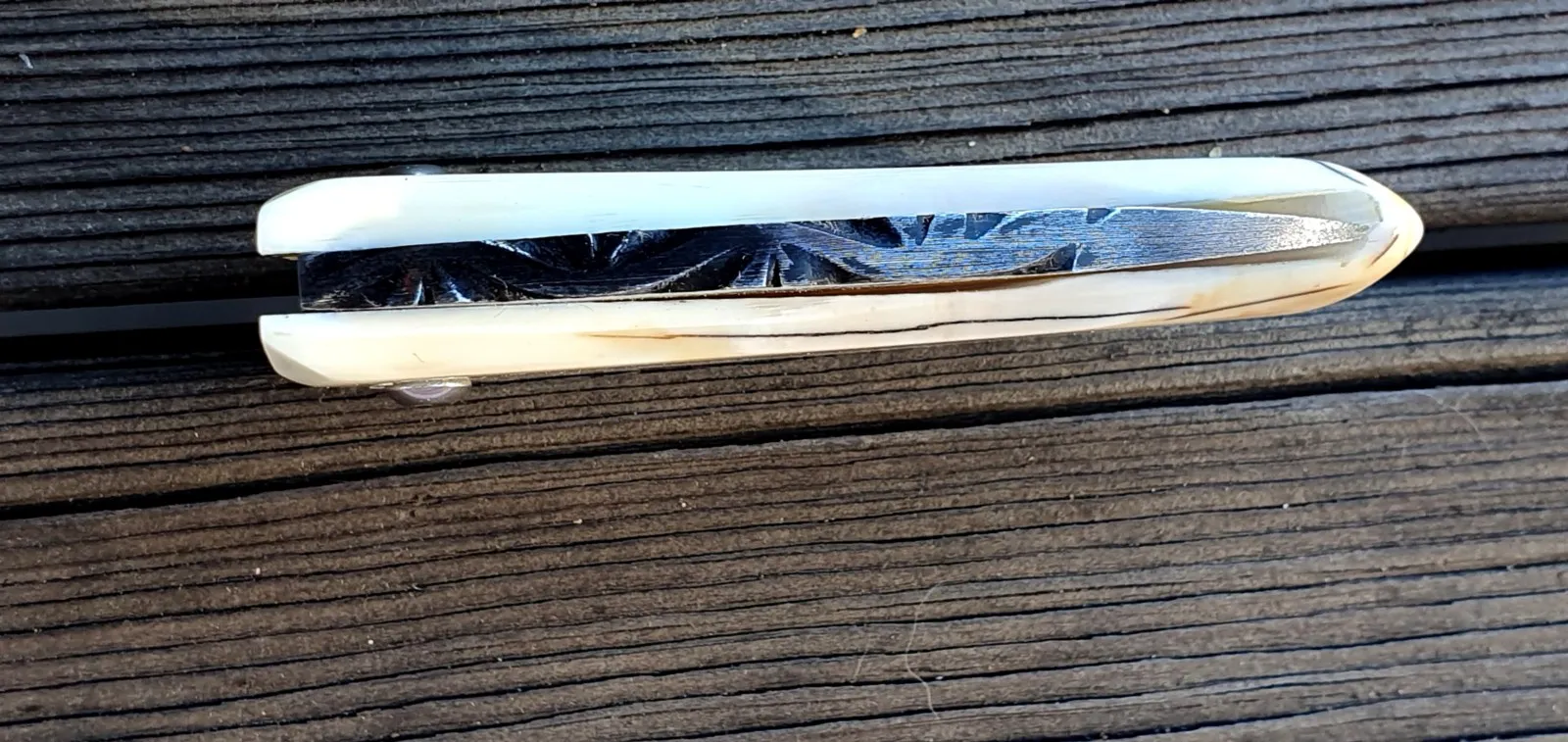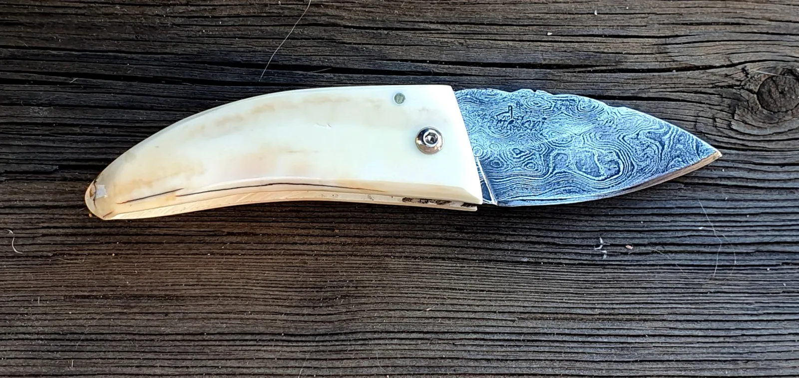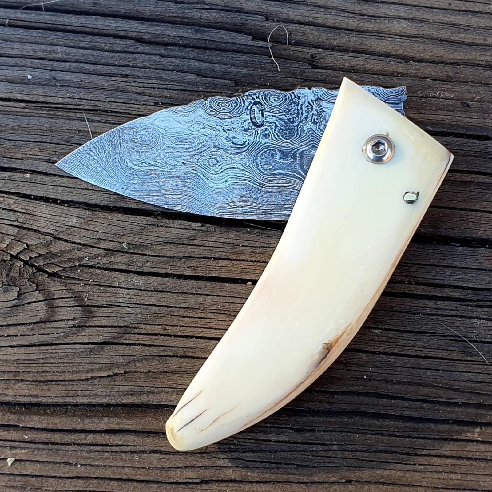 Un couteau corse pliant de fabrication traditionnelle Labellisé avec une Lame damas épaisseur de 4 mm avec un manche réalisé en défense de phacochère