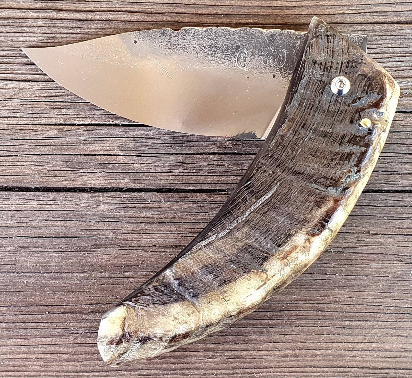 Un couteau corse pliant de fabrication traditionnelle Labellisé avec une Lame acier épaisseur de 3 mm avec un manche réalisé en corne de bélier