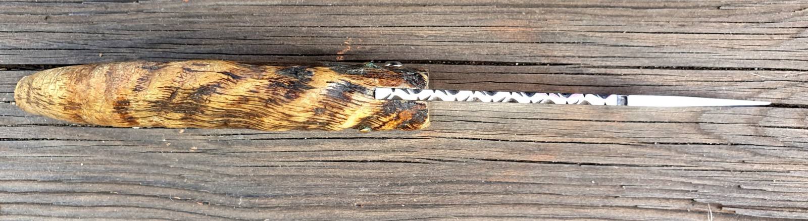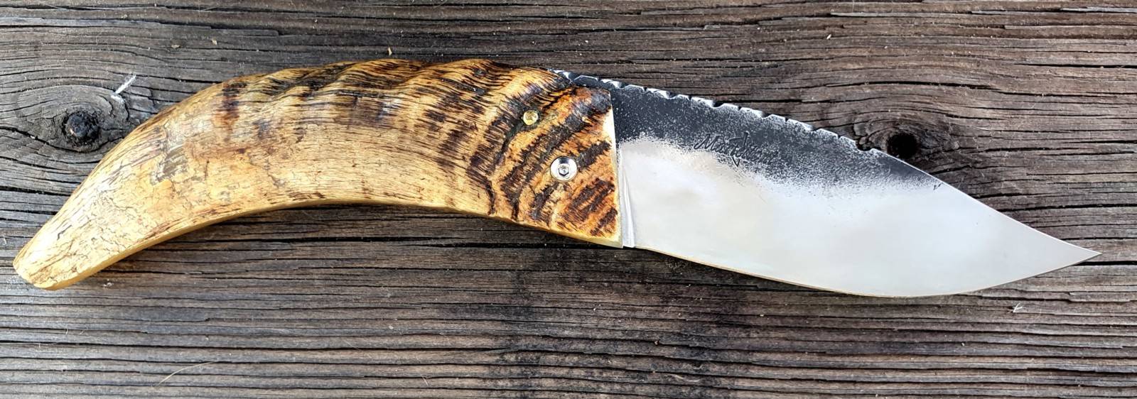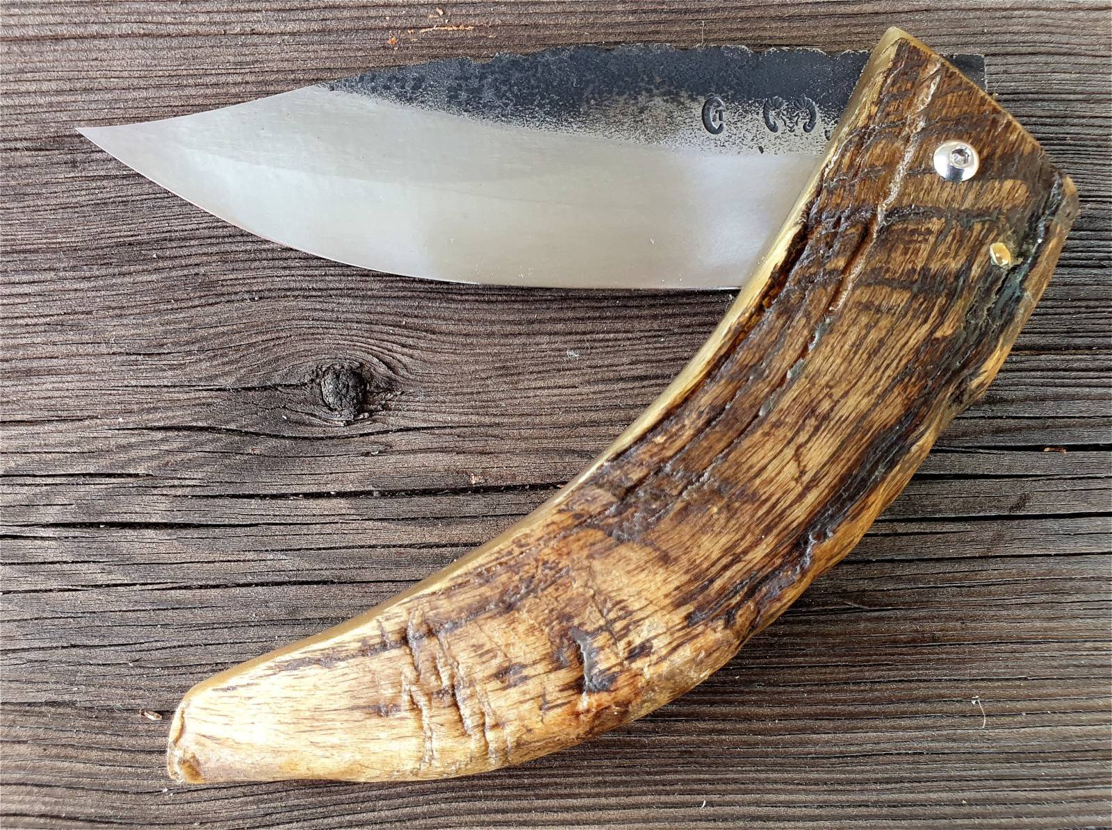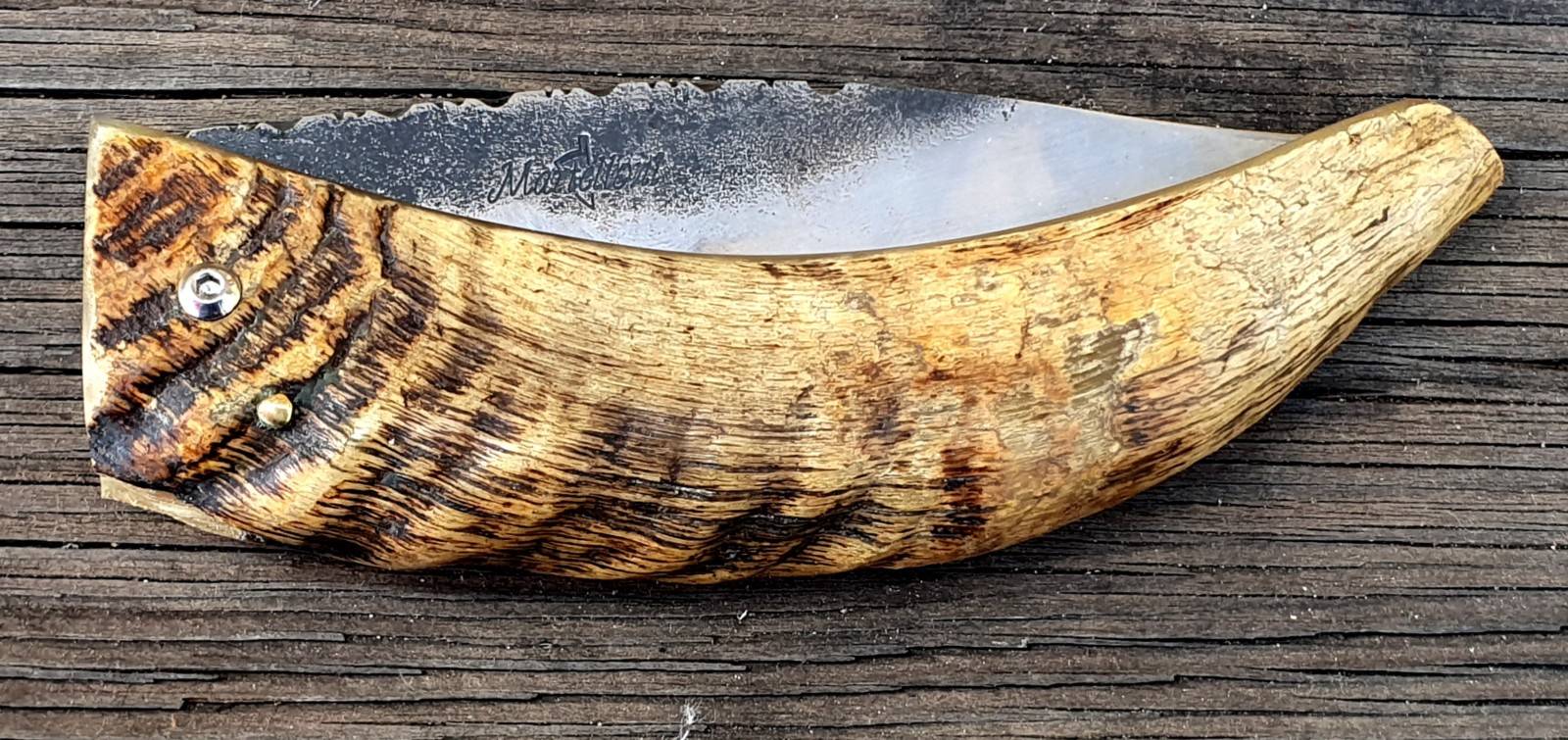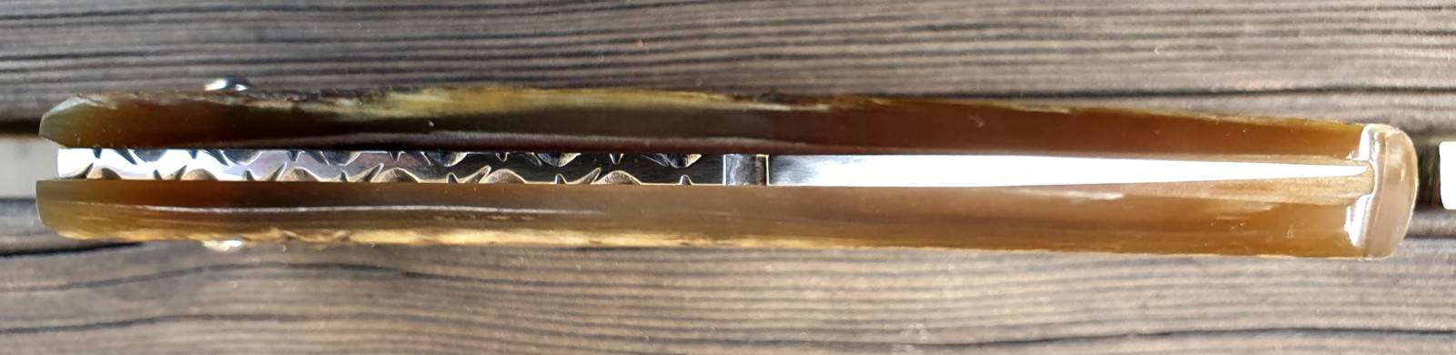 Un couteau corse pliant de fabrication traditionnelle Labellisé avec une Lame acier épaisseur de 3 mm avec un manche réalisé en corne de bélier